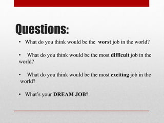 This document provides descriptions of various occupations. It lists jobs such as professional athlete, cashier, pharmacist, manager, dentist, veterinarian, zookeeper, housekeeper, stay-at-home parent, artist, musician, scientist, waiter, shop assistant, barista, secretary, construction worker, fashion designer, wedding planner, photographer, author, journalist, hair stylist, plumber, conservationist, accountant, lawyer, butcher, security guard, personal trainer, computer programmer, and politician. It provides a brief 1-2 sentence description of the typical duties for each occupation.