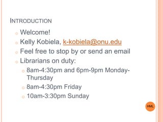 This document provides an introduction and overview of research resources and services available at Heterick Memorial Library. It summarizes the layout of the library building across three floors, describes technology and study spaces available on each floor. It also outlines key research tools like the library catalog, databases, interlibrary loan services and RefWorks for citations. Librarians are available for help from 8am-4:30pm and 6pm-9pm Monday through Thursday and 8am-4:30pm on Friday.