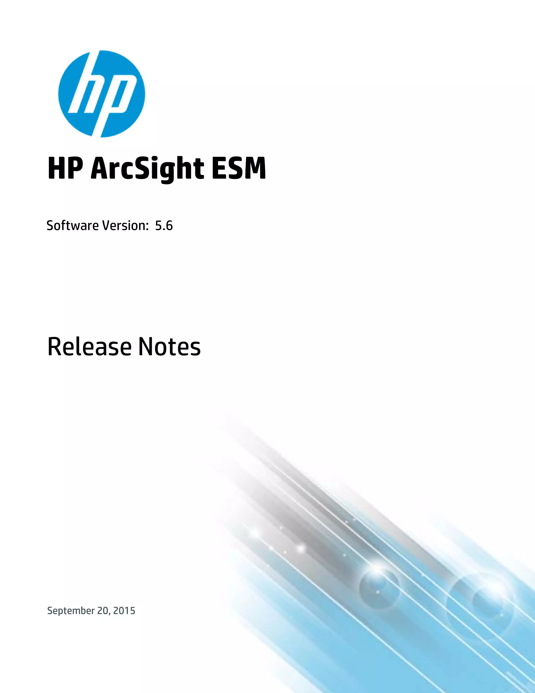 ESM 5.6 provides updates to Oracle, Red Hat Linux, and CentOS support. It addresses the POODLE vulnerability and fixes issues in ESM 5.5. This release also includes updates to geographical information and vulnerability mappings from July 2015. Usage notes cover Forwarding Connector version, browser requirements, and an Oracle Enterprise Manager issue. The release notes describe fixed issues and list several open issues remaining in areas like Analytics, the ArcSight Console, and the ArcSight Database.
