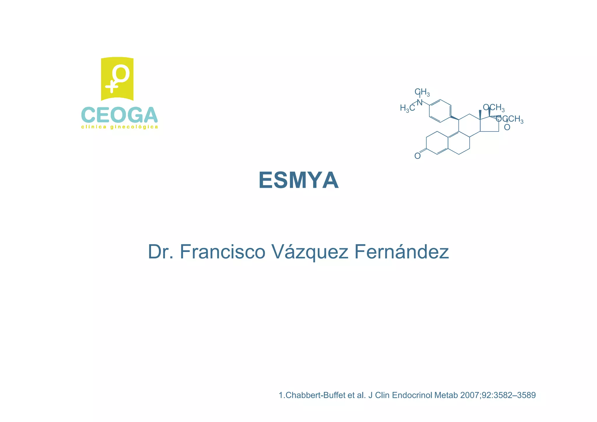 This document provides information on ESMYA (ulipristal acetate), a selective progesterone receptor modulator being studied for the treatment of uterine fibroids. It summarizes results from Phase II and Phase III clinical trials that showed ESMYA significantly reduced fibroid size and bleeding compared to placebo. The Phase III PEARL I and PEARL II trials are further evaluating ESMYA's efficacy and safety profile compared to placebo or a gonadotropin-releasing hormone agonist. Additional trials are exploring long-term use of ESMYA and its effects on bleeding patterns, endometrial histology, and potential for uterus-sparing treatments.