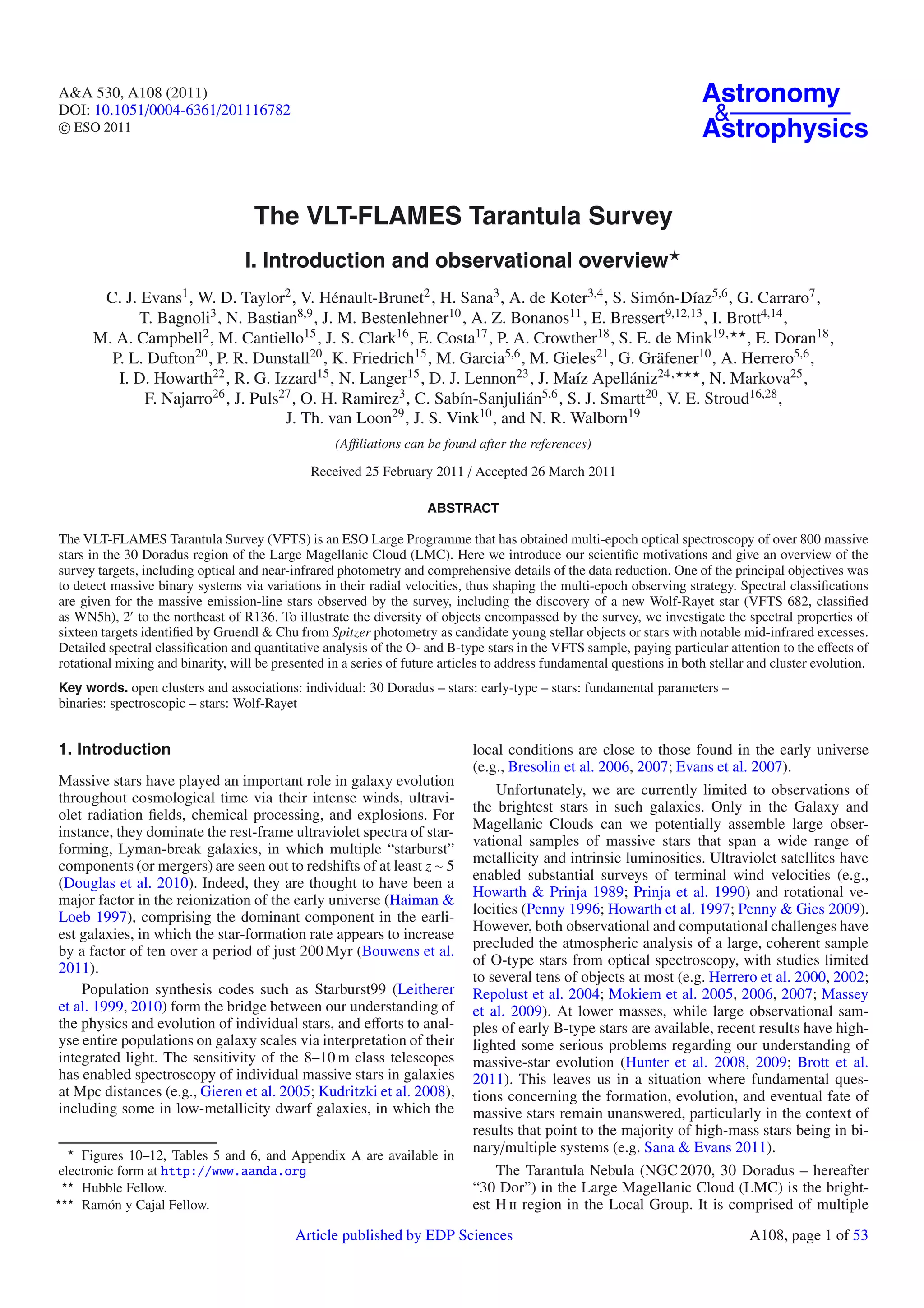 This document introduces the VLT-FLAMES Tarantula Survey, which obtained multi-epoch optical spectroscopy of over 800 massive stars in the 30 Doradus region of the Large Magellanic Cloud. The survey aims to detect massive binary systems through variations in radial velocities and to characterize the properties of O- and B-type stars, addressing questions about stellar and cluster evolution. Spectral classifications are provided for newly discovered emission-line stars, including a new Wolf-Rayet star. The survey data and reduction procedures are overviewed, and upcoming analyses of the massive star properties are announced.