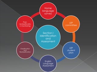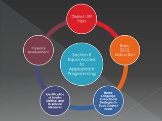 The ESOL Consent Decree was signed in 1990 as a settlement to ensure Florida provided equal education to limited English proficient (LEP) students. It establishes Florida's framework for complying with federal laws regarding English language learner (ELL) education. The Decree addresses identification and assessment of ELL students, equal access to programming, personnel qualifications, monitoring compliance, and evaluating outcomes to ensure equal opportunities for ELL students.
