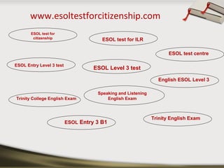 The document outlines the ESOL test for citizenship offered by Intech Centre, which consists of a 10-minute speaking and listening English exam. The ESOL Level 3 test is required for citizenship and settlement applications in the UK. Contact information for the centre is provided, including their address and email.