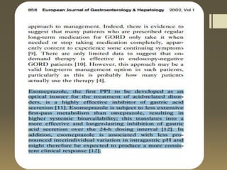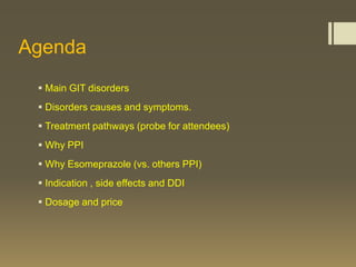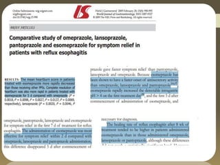 Esomeprazole is the most advanced PPI for acid regulation. It is more effective than omeprazole at reducing acid production due to higher bioavailability from less first-pass metabolism. Esomeprazole has indications for treating GERD, dyspepsia, H. pylori infection, erosive esophagitis, NSAID-induced ulcers, and pathological hypersecretory conditions. It has typical PPI side effects like diarrhea and headaches. Esomeprazole has drug-drug interactions and its dosage depends on the condition being treated, ranging from once daily for GERD to twice daily for Zollinger-Ellison syndrome.