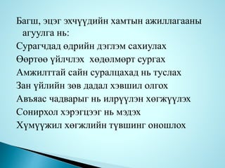 БОЛОВСРОЛЫН БОДЛОГО БОЛОВСРУУЛАХ, ХЭЛЭЛЦЭХ, ХЯНАЖ ҮНЭЛЭХЭД ЭЦЭГ ЭХ, ИРГЭНИЙ Н... PPTX