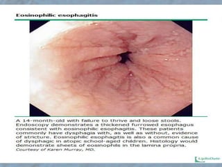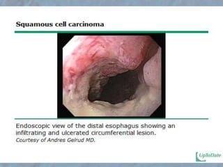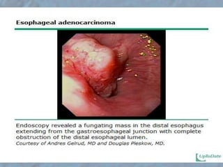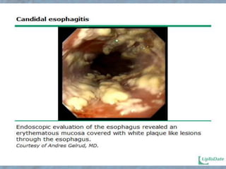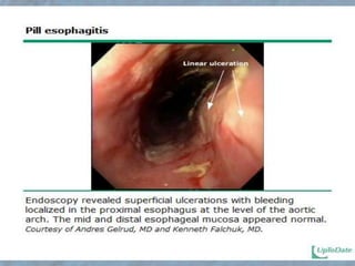 Esophagitis is inflammation of the esophagus that can have various causes like acid reflux, infections, medications, radiation, and more. Common symptoms include dysphagia, heartburn, and painful swallowing. Diagnosis involves endoscopy and biopsy. Treatment depends on the underlying cause but may include lifestyle changes, antacids, H2 blockers, proton pump inhibitors, and surgery in some cases. Complications can include strictures and Barrett's esophagus.
