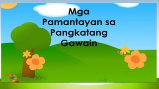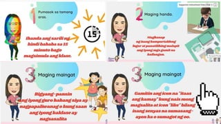 Ang dokumento ay nagtutuon sa pagtataguyod ng tunay na pagmamahal at pag-aalaga sa kapwa bilang bahagi ng mga layunin ng mga mag-aaral sa ikalimang baitang. Kabilang sa mga aktibidad ang mga pagsasaalang-alang sa kapakanan ng kapwa at pakikiisa sa mga programa ng lokal na pamahalaan. Nakatuon din ang dokumento sa pagbuo ng kamalayan sa mga gawain na makakatulong sa mga biktima ng kalamidad at sa pagpapahalaga ng mga aral mula sa Bibliya ukol sa pagtulong.