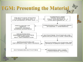 The document discusses the design and role of materials in English for Specific Purposes (ESP) teaching, highlighting various forms, sources, and selection criteria. It emphasizes the importance of tailoring materials to the learners' needs and integrating different skills and activities to enhance the learning experience. Additionally, it addresses considerations for teachers when selecting materials to ensure they are engaging, relevant, and appropriate for the students.