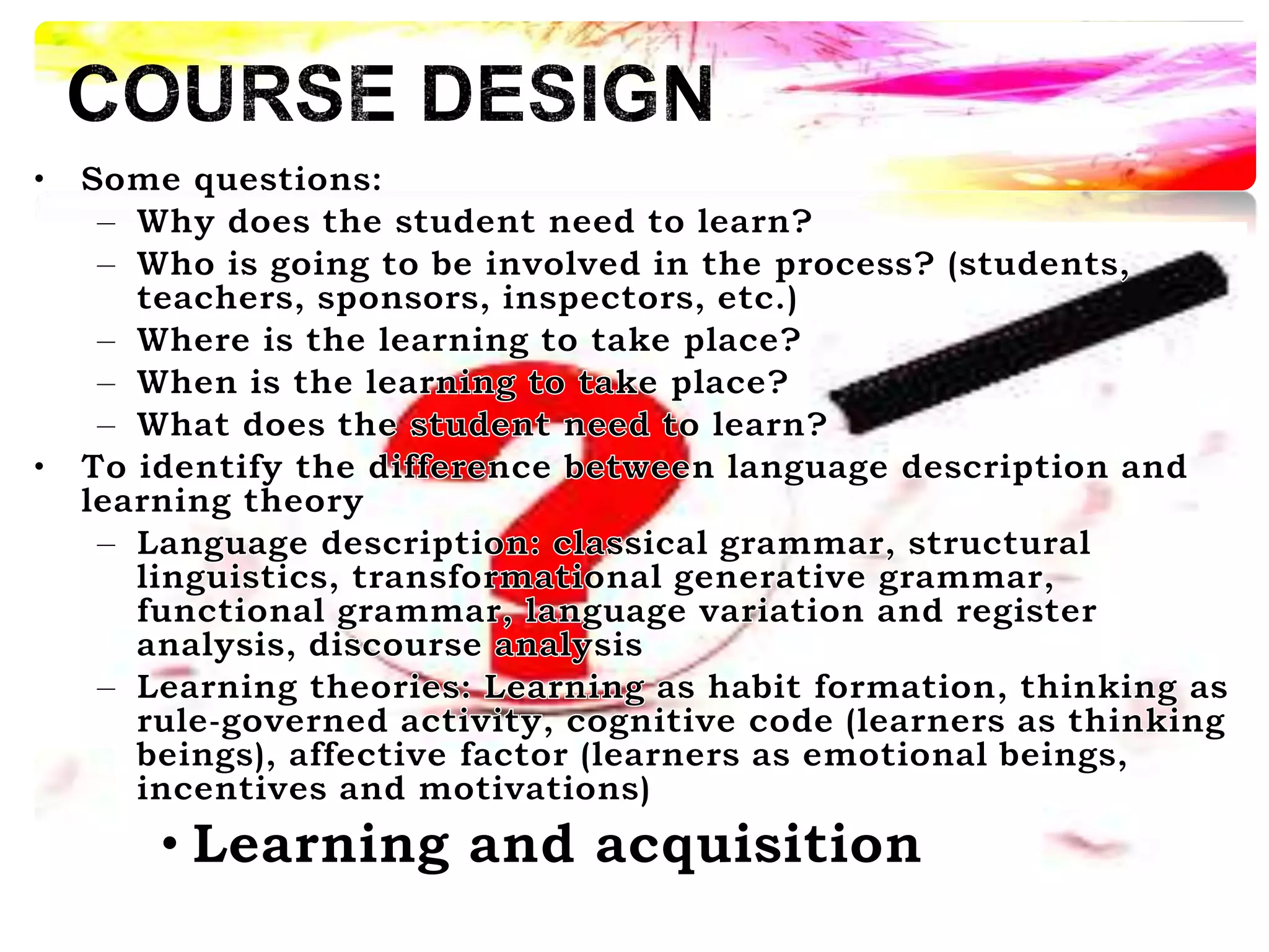 Course design interprets learning needs to create teaching experiences aimed at specific knowledge acquisition.
