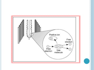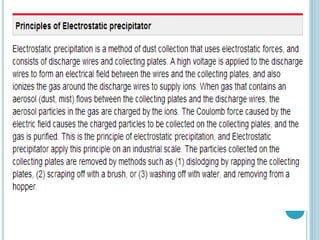 An electrostatic precipitator (ESP) removes dust particles from gas streams like air using electrostatic attraction. It has high-voltage discharge electrodes that ionize gas molecules, and positively charged collection electrodes that attract the ionized dust particles. The ESP operates in three stages: particle charging by corona discharge from the electrodes, transport of charged particles towards the collection plates, and collection of particles on the positively charged collection plates. ESPs are highly efficient filtration devices that allow gases to flow through while removing fine particulate matter like dust and smoke.