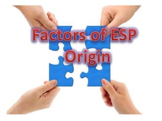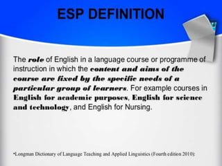 This document discusses the origins and birth of English for Specific Purposes (ESP). It traces how ESP emerged from the post-war growth of technology and commerce, which generated demand for an international language. As English became the dominant language in these fields, new learners sought to acquire English skills for specific professional reasons. Events like the 1970s Oil Crisis further commercialized English learning. ESP then developed to meet the precise language needs of various occupations and professions by designing content and teaching methods based on learners' goals.