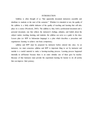 The document provides an analysis of the syllabus for an English for Specific Purposes course. It includes the course name, instructor details, and an introduction explaining the importance of syllabi. The content section outlines the course description, learning outcomes, assessment methods, topics, and lesson plans. The lesson plans provide learning objectives, teaching methods, and content for each topic. Overall, the document analyzes the structure and components of the syllabus to guide the English for Specific Purposes course.