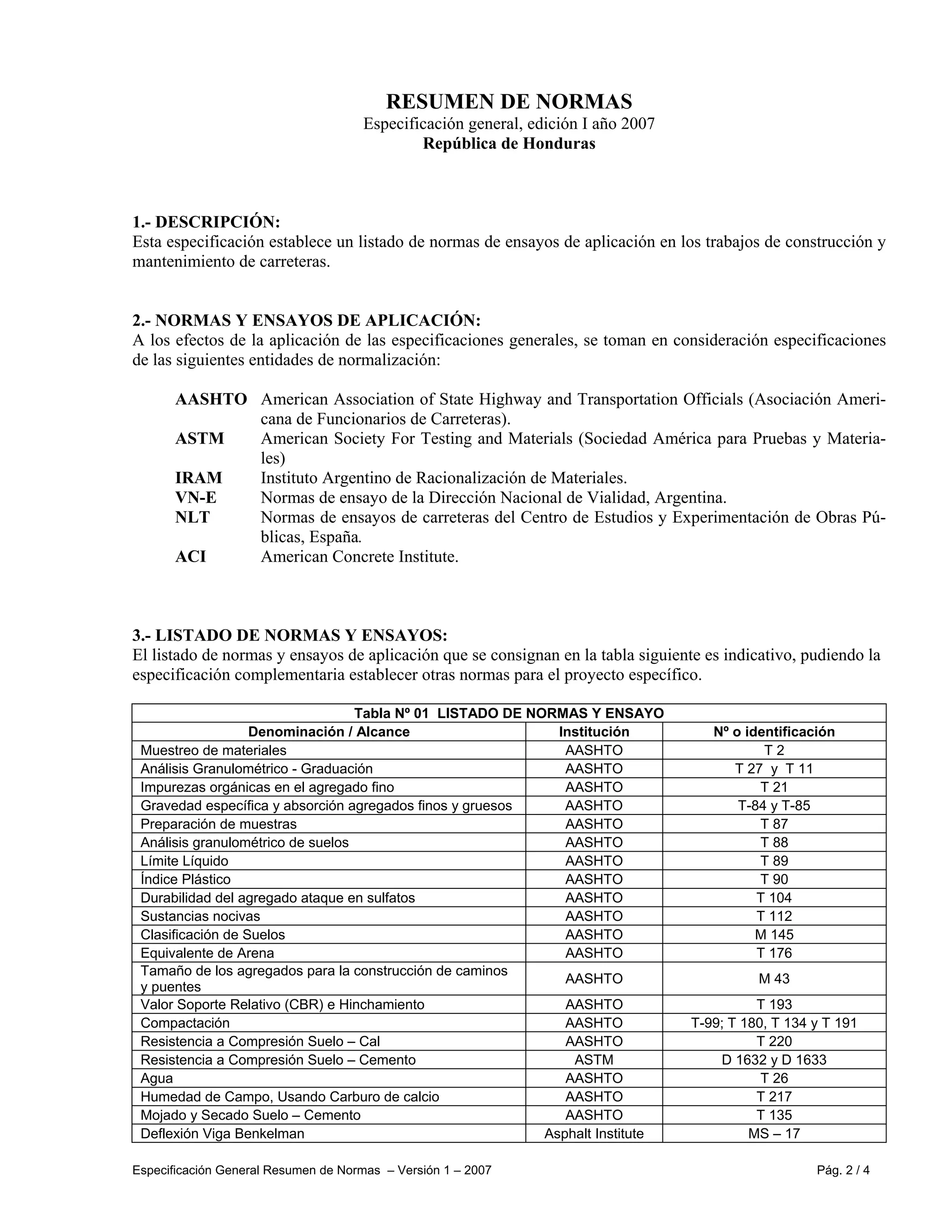 Esta especificación establece un listado de normas de ensayos de aplicación en los trabajos de construcción y