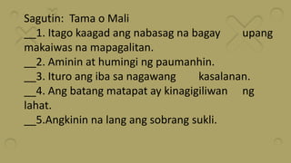 Ang dokumento ay naglalaman ng mga aralin ukol sa pagpapakatao, partikular sa pagtulong sa kapwa sa panahon ng kagipitan. Itinampok dito ang mga kwento ng mga bata tulad nina Loleng at Betina na nagpakita ng pagmamahal sa kapwa sa pamamagitan ng pagtulong sa mga nasunugan at mga naapektuhan ng pagbaha. Tinalakay din ang mga angkop na asal at mga hakbang na maaaring gawin upang makatulong sa mga nangangailangan.