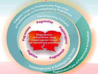 Ang dokumento ay nagpapahayag ng mga hamon at layunin ng K-12 Basic Education Program sa Pilipinas, na nakatuon sa pagbuo ng mga estudyanteng may responsableng pagkilos para sa kabutihang panlahat. Tinalakay nito ang mga pangunahing tema at pagpapahalaga na dapat mahalagahan ng mag-aaral, pati na rin ang proseso ng pag-unawa, pagninilay, pagsangguni, pagpapasya, at pagkilos. Ang mga pagpapahalagang nakabatay sa pitong dimensyon ng paglinang ng indibidwal ay nagbibigay-diin sa kahalagahan ng holistic na pag-unlad sa iba't ibang aspeto ng buhay.