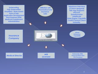 This document describes the services provided by Elite Sales Processing, Inc. (ESP) for application processing. ESP offers point of sale and rules-based underwriting programs that can approve applications within 8 minutes. They conduct MIB searches, fraud checks, and make approve/decline decisions. Approved applications are issued policies by Certainty Financial Assurance (CFA) who handles front and back-end administration. The Amplified team provides a turnkey program for customers with minimal capital requirements and an experienced team to manage for results.