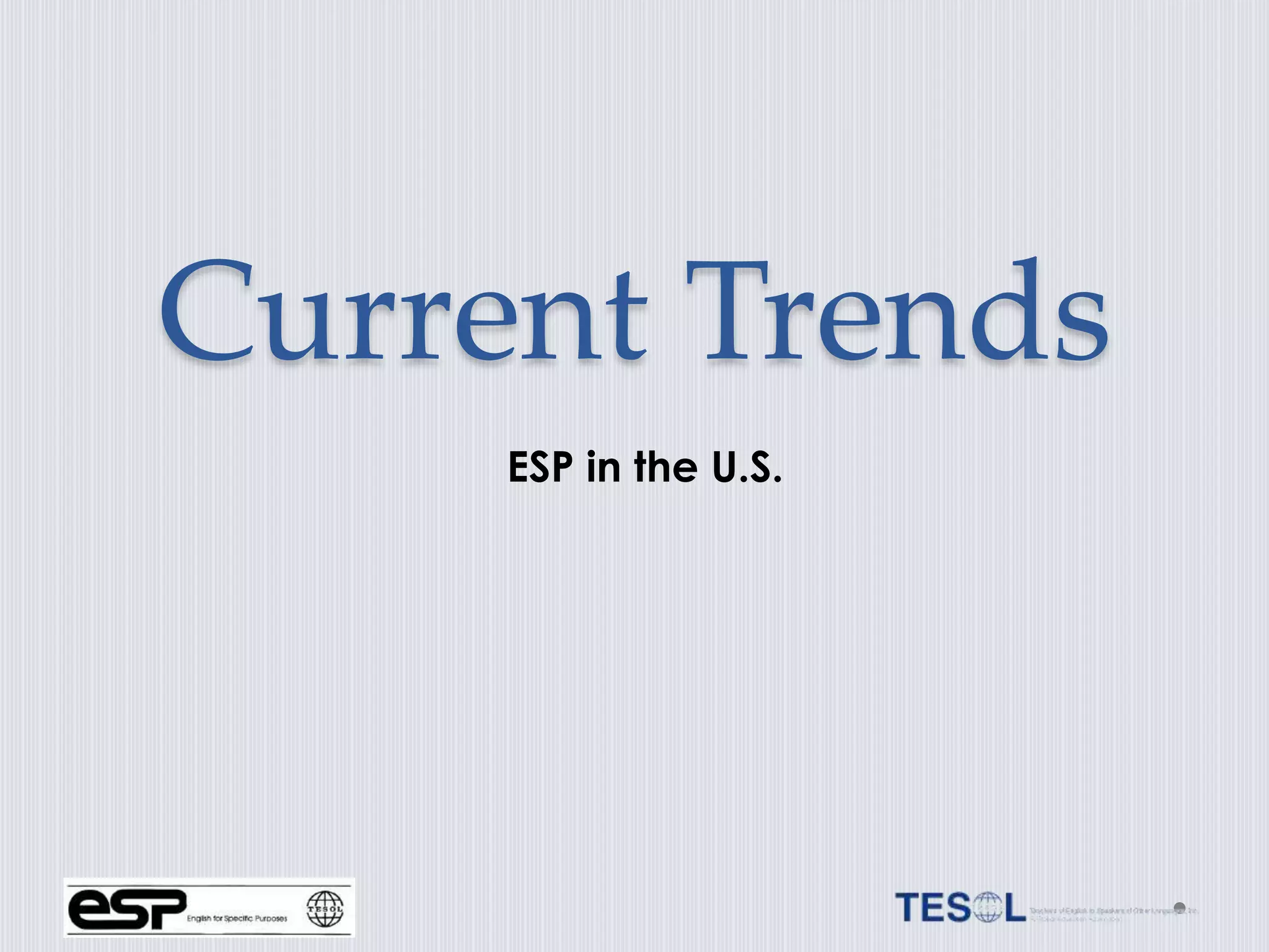 The document discusses trends in ESP teacher training programs in the United States. It notes that while some universities offer individual courses related to ESP, full ESP training programs are limited. It provides examples of some courses offered at various institutions. The document also discusses practical research approaches for ESP instructors, including genre analysis and corpus linguistics. It provides examples of how these research methods have been applied. Finally, it discusses adapting materials for ESP courses and harnessing online resources to develop materials.