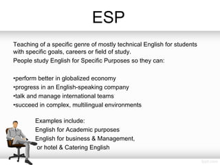 The document discusses English for Specific Purposes (ESP), which teaches English in the context of a specific field or occupation. ESP focuses on the language needs of students' careers or studies, rather than general English skills. It integrates English learning with subject matter important to students. Examples include English for academic purposes, business, and hospitality. ESP motivates students by making English relevant to their goals and uses authentic materials from their domains.