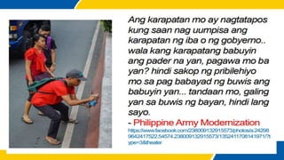This document discusses human rights, duties, and responsibilities. It identifies key rights such as the right to life, private ownership, marriage, faith, and work. It also examines violations of human rights that can occur in the family, school, community, or nation. Maintaining everyone's rights is important for civil society to function properly. The document provides terms related to rights, duties, and roles. It discusses specific rights of Filipino children and the relationship between rights and responsibilities. Students are tasked to identify statements as rights or roles and provide examples of human rights violations and solutions to preserve rights.