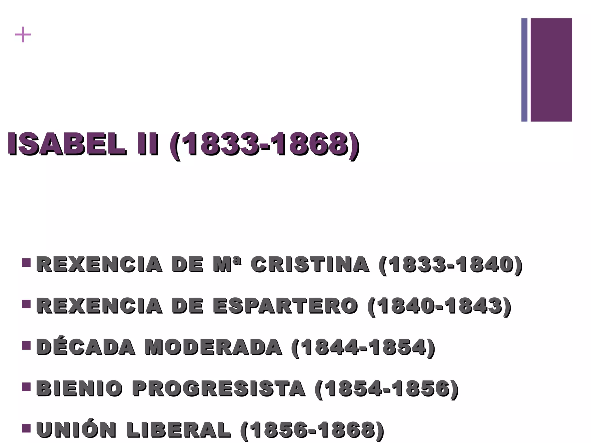 ISABEL II (1833-1868)REXENCIA DE Mª CRISTINA (1833-1840) REXENCIA DE ESPARTERO (1840-1843) DÉCADA MODERADA (1844-1854) BIENIO PROGRESISTA (1854-1856) UNIÓN LIBERAL (1856-1868)