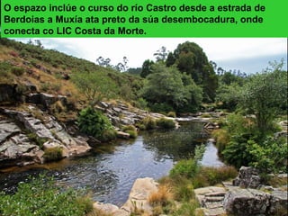 Proposto en 2011 como Lugar de importancia comunitaria (LIC) e Zona especial de conservación (ZEC). Está pendente de aprobación. O espazo inclúe o curso do río Castro desde a estrada de Berdoias a Muxía ata preto da súa desembocadura, onde conecta co LIC Costa da Morte. CONCELLOS: Vimianzo, Muxía, Dumbría e Cee.