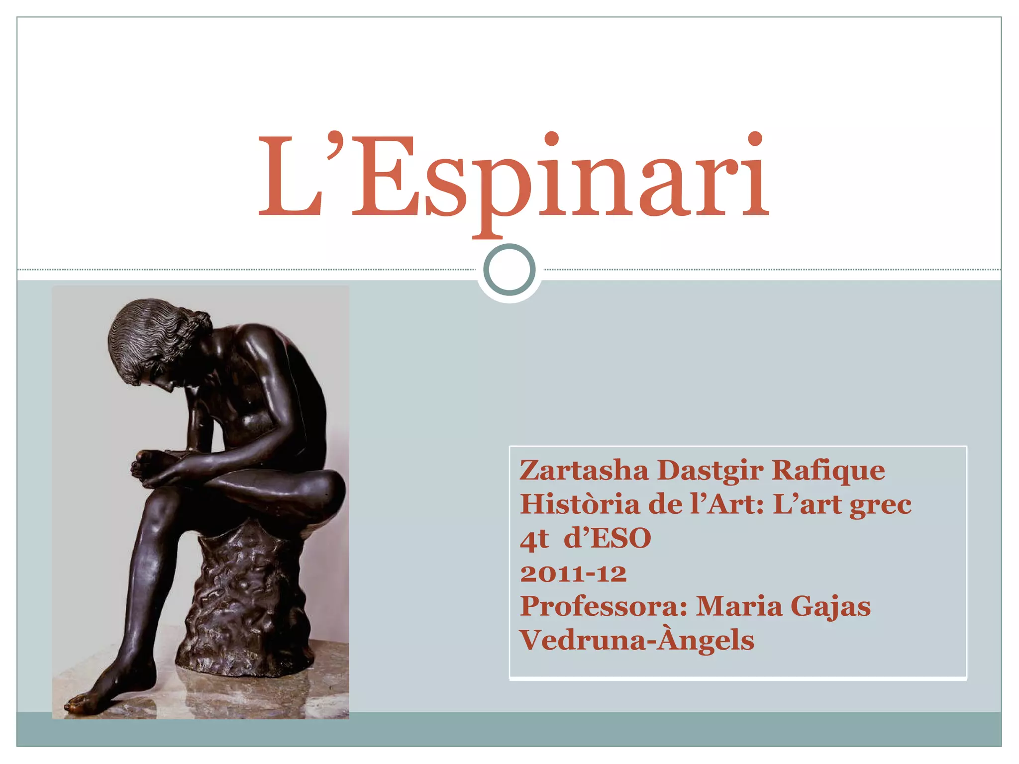 L’Espinari Anàlisi FormalÉs una estàtua, de bronze d'un nen assegut traient una espina de la planta del peu esquerre . Fa l’expressió de concentració. Ja està registrada a Roma al segle XII, i durant el Renaixement va ser una de les escultures antigues de major influència. Aquesta barreja de característiques fa que aquesta sigui una estàtua interessantíssima per als amants de l'art .