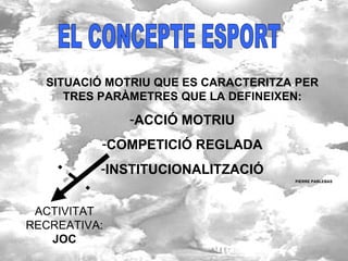 EL CONCEPTE ESPORTSITUACIÓ MOTRIU QUE ES CARACTERITZA PER TRES PARÀMETRES QUE LA DEFINEIXEN: ACCIÓ MOTRIU COMPETICIÓ REGLADA INSTITUCIONALITZACIÓ PIERRE PARLEBAS ACTIVITAT RECREATIVA: JOC
