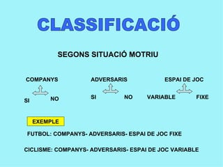 CLASSIFICACIÓ SEGONS SITUACIÓMOTRIU COMPANYS ADVERSARIS ESPAI DE JOC SI NO SI NO FIXE VARIABLE EXEMPLE FUTBOL: COMPANYS- ADVERSARIS- ESPAI DE JOC FIXE CICLISME: COMPANYS- ADVERSARIS- ESPAI DE JOC VARIABLE