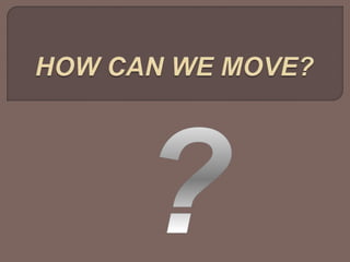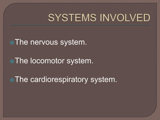The document summarizes three body systems involved in movement: the nervous system, locomotor system, and cardiorespiratory system. The nervous system sends movement orders from the brain to muscles through the spinal cord and nerves. The locomotor system produces movement using the skeleton and muscles. Muscle contraction causes bone movement. The cardiorespiratory system provides the energy for muscle contraction through oxygen delivery from the lungs to the bloodstream by the heart. Together these systems work to initiate and power physical movement.