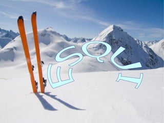 ESPAI L'espai necessitatper la practica de l'esqui es necessiten una muntanya,ara a les ciutats es fan llocs on es pot esquiar les pistes de Catalunya,són la Molina,la Masella,Espot,Bou taull,el port del compte etc.