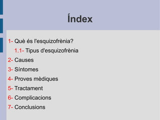 Índex 1- Què és l'esquizofrènia? 1.1- Tipus d'esquizofrènia 2- Causes 3- Síntomes 4- Proves mèdiques 5- Tractament 6- Complicacions 7- Conclusions