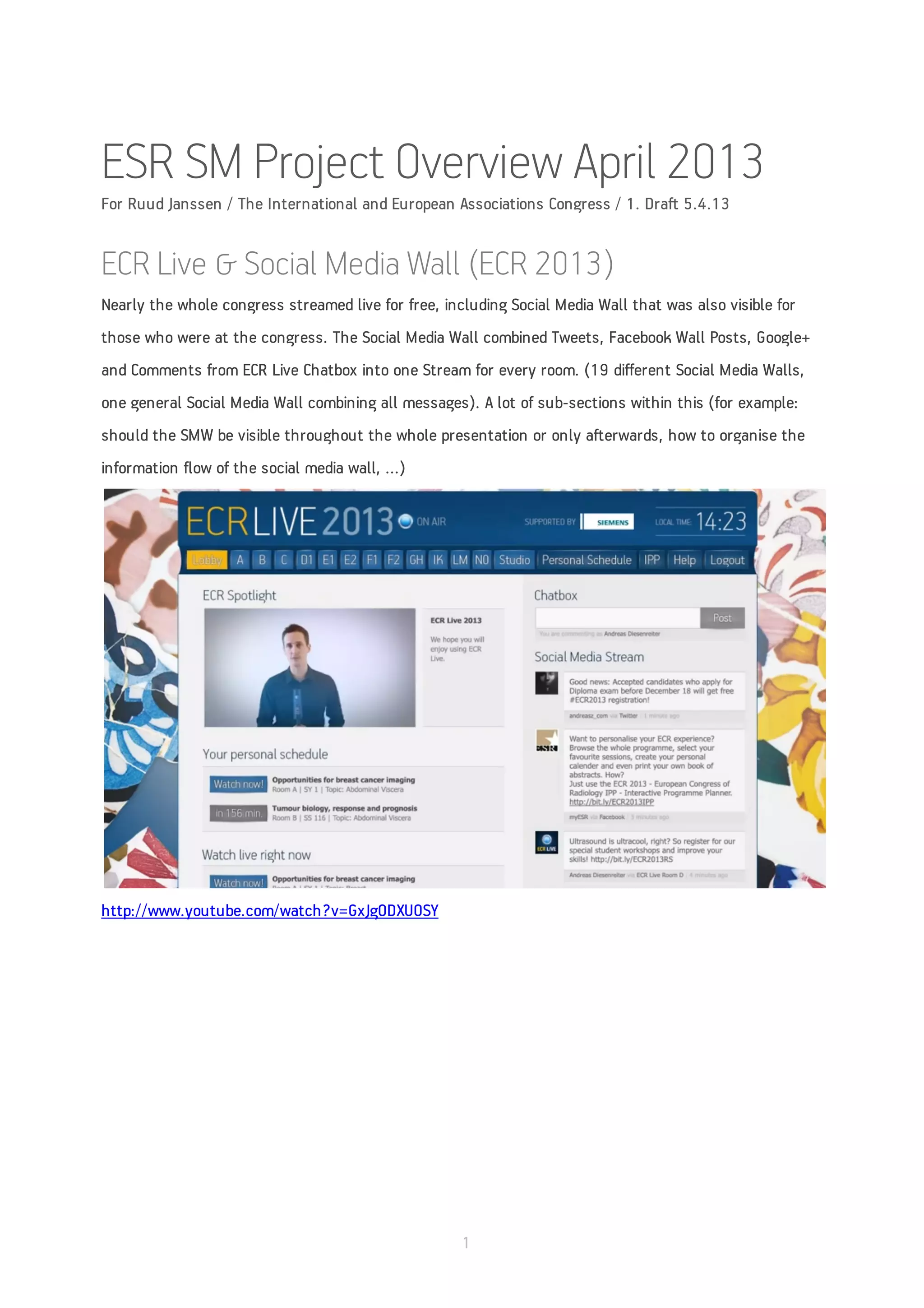 1. Live streaming and a social media wall combining tweets, posts, and comments for an international radiology congress in 2013.
