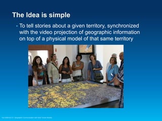 This document discusses the use of solid terrain models and geographic information systems (GIS) to enhance geographic communication and public participation in territorial management. It outlines the benefits of 3D physical models in conveying complex information, improving audience comprehension, and facilitating better decision-making processes. Various projects in Portugal demonstrate the application of these concepts in sustainable tourism, education, and community engagement.