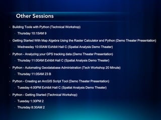 This document summarizes a technical workshop on integrating standard and third-party Python libraries for use in ArcGIS. It discusses leveraging built-in Python libraries for common tasks like file I/O, networking, and data structures. It also covers finding and installing third-party libraries from the Python Package Index and providing examples of libraries for tasks like PDF generation, image processing, and Excel integration. The document emphasizes exploring Python's documentation and reusing existing libraries rather than reimplementing functionality.