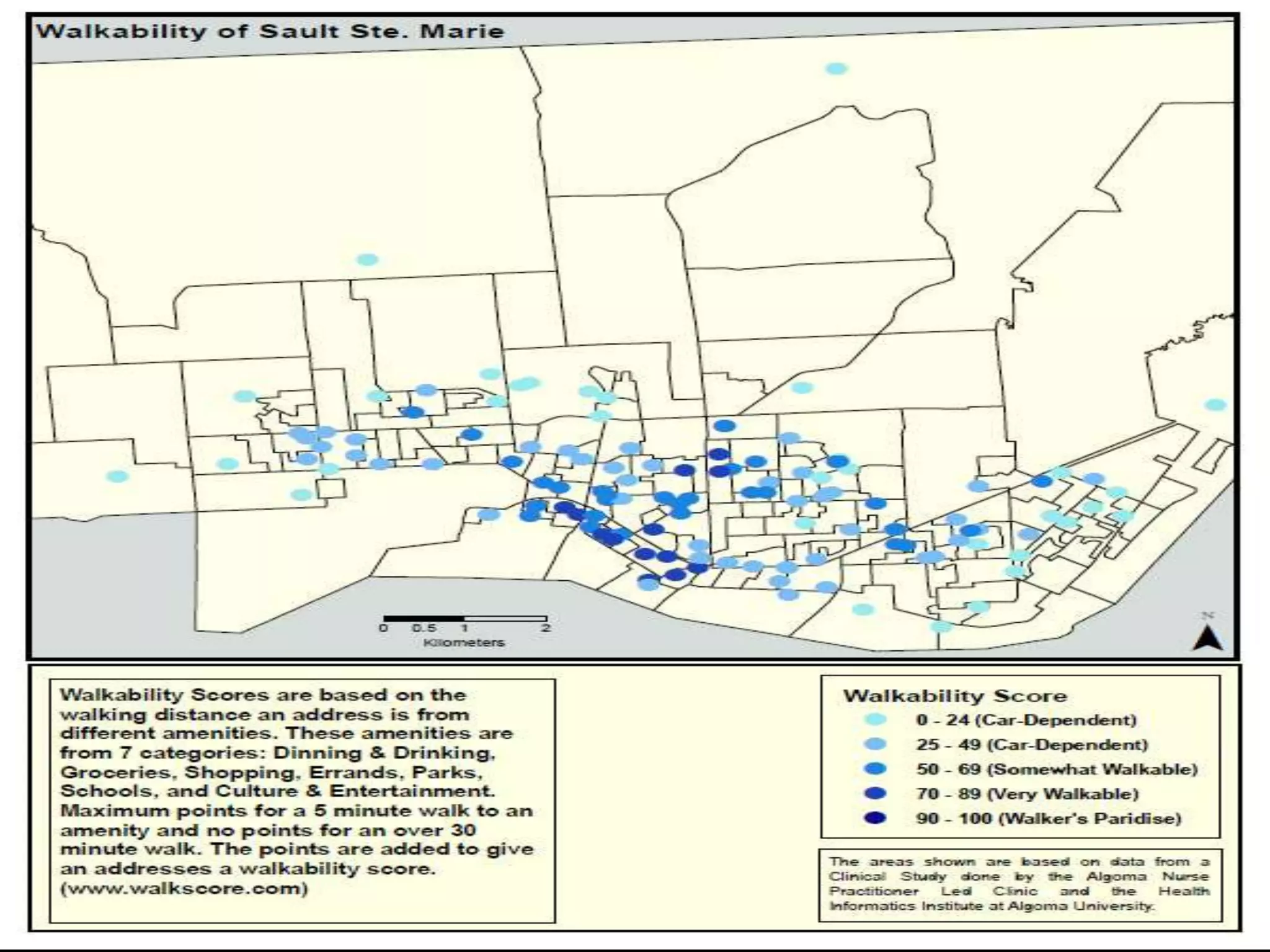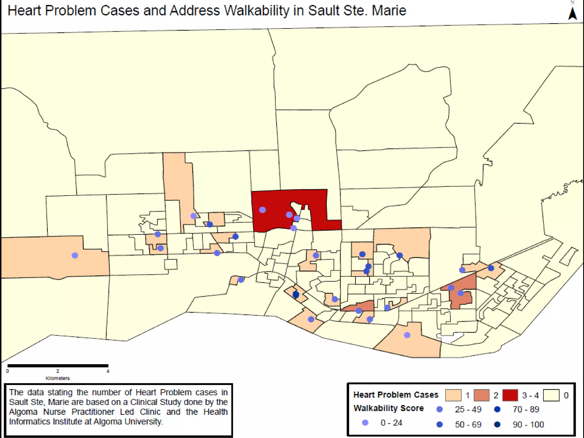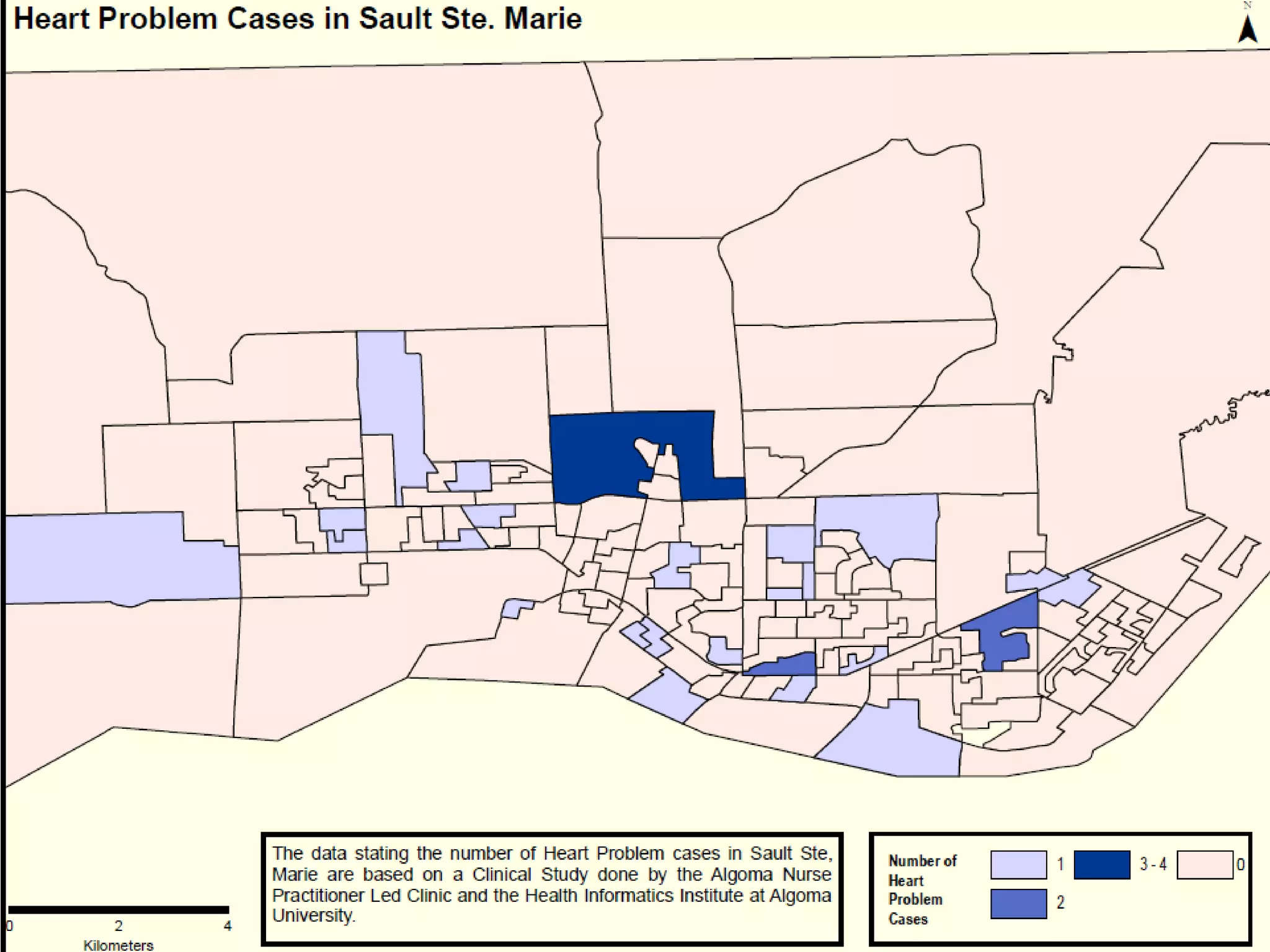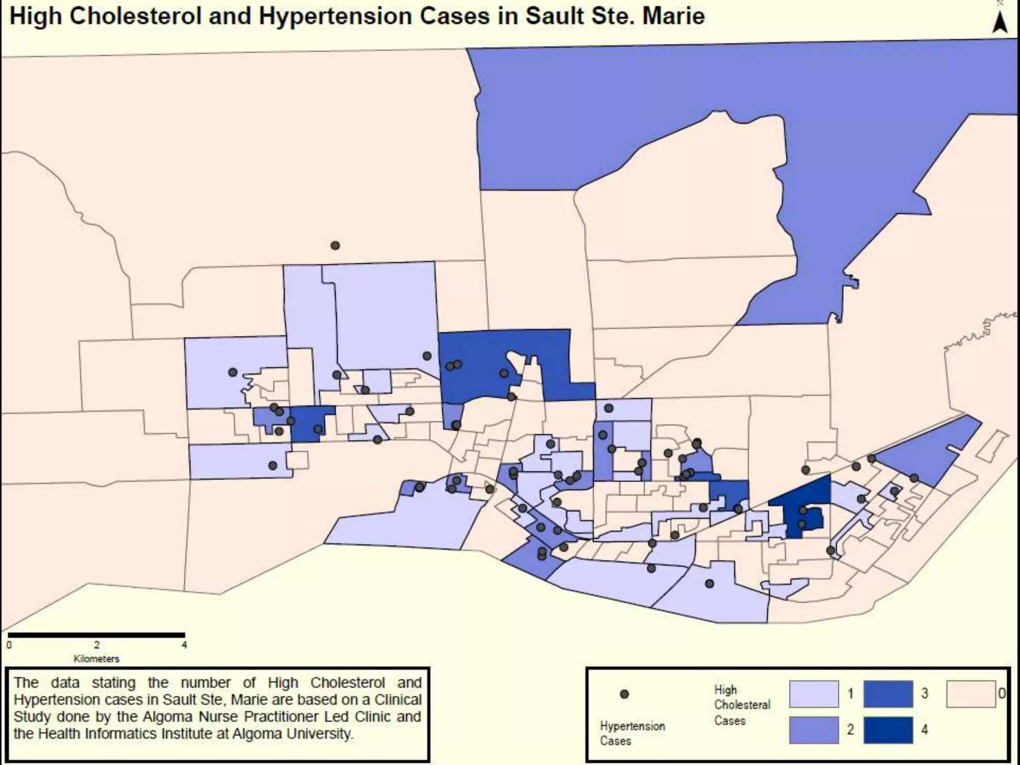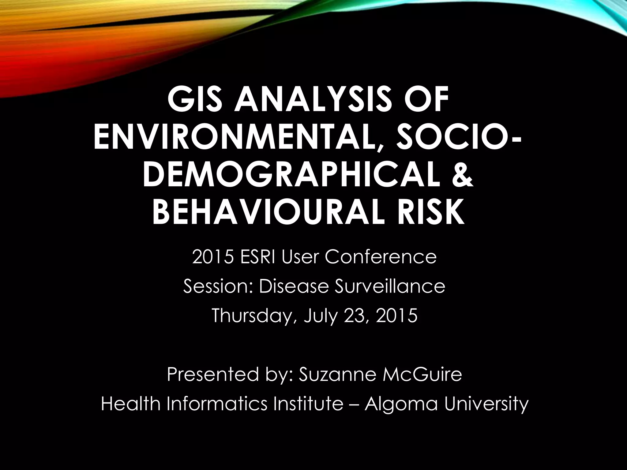 This document summarizes a GIS analysis study conducted by the Health Informatics Institute – Algoma University to understand chronic disease risk factors in the Algoma Region and facilitate individualized care plans. Over 1,000 patients were recruited through mailed surveys and phone calls. Geographic, health, and socioeconomic data were collected and layered in a GIS analysis. This identified relationships between behavioral, environmental, and demographic attributes and health issues. The results provided insights into the patient population to guide more personalized care. Future studies could replicate successful recruitment methods and apply findings to both individual patient care and public health promotion.