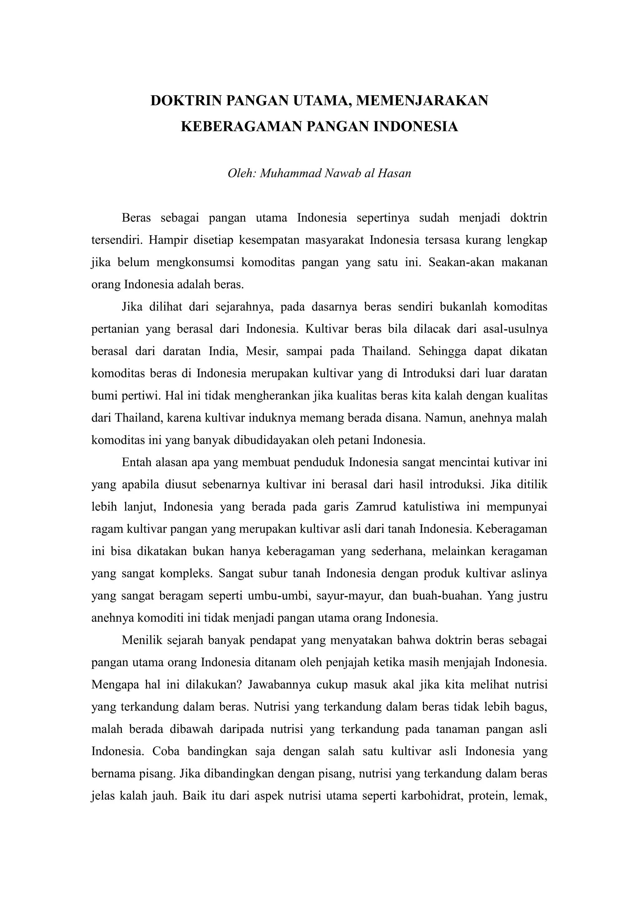 Dokumen tersebut membahas tentang dominasi beras sebagai pangan utama di Indonesia padahal sebenarnya Indonesia memiliki keanekaragaman pangan lokal. Beras bukanlah komoditas asli Indonesia melainkan dari luar negeri. Doktrin beras sebagai pangan utama diduga ditanamkan penjajah untuk melemahkan nutrisi masyarakat Indonesia. Untuk bangkit, perlu mengembalikan keanekaragaman pangan lokal seperti umbi-umbian, sayuran,