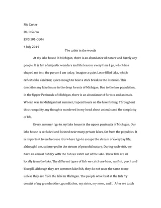 The author describes their lake house located in the Upper Peninsula of Michigan. It is secluded and surrounded by nature, providing a place of serenity and escape from everyday life. During visits, the author enjoys activities like fishing and learning to clean the fish. Interacting with nature at the lake house has taught the author life lessons about respecting the environment and living creatures. These experiences have shaped the person the author is today and influenced their career choice working with landscaping.