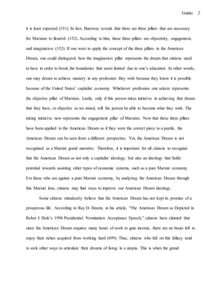 This document discusses analyzing the American Dream through a Marxist lens. It argues that applying Marxism can reveal hidden relationships between exploiters and exploited within capitalist societies. While the American Dream promises prosperity through hard work, some groups like immigrants face barriers that prevent them from achieving this. Examining the Dream with Marxism can help identify flaws and improve economic justice. However, a fully Marxist system could also create new exploiter/exploited dynamics. Overall, studying Marxism is useful to critically analyze economic systems like the American Dream, not to abandon capitalism altogether.