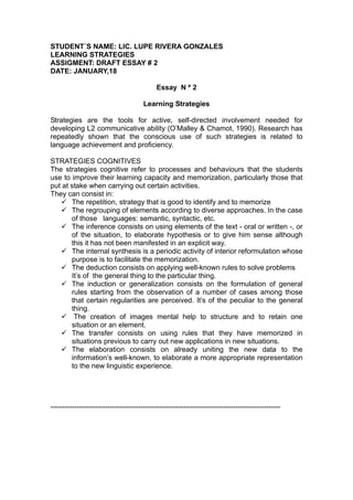 The document discusses learning strategies for developing second language ability. It defines cognitive strategies as processes and behaviors students use to improve learning and memorization when carrying out activities. Some examples of cognitive strategies provided are repetition to identify and memorize, regrouping elements according to semantic or syntactic approaches, making inferences using elements from texts or situations, internal synthesis to facilitate memorization, deduction by applying known rules, induction to form general rules from observations, creating mental images to structure and retain information, and transfer by applying memorized rules to new situations.