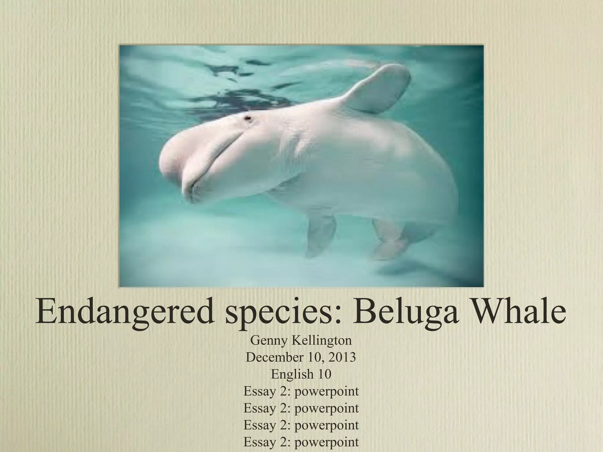 The document discusses the endangered beluga whale. It describes the beluga whale's appearance as white in color with no dorsal fin. Belugas live in Arctic waters but migrate south in summer. The document outlines threats to belugas like hunting, pollution, and habitat loss. Protecting beluga habitats and reducing accidental injuries from activities like fishing can help save the struggling population.