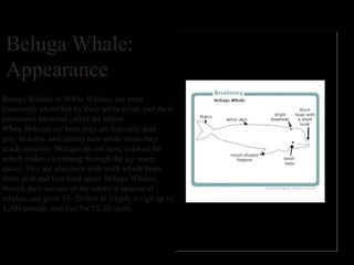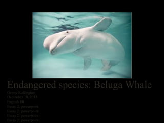 The document discusses the endangered beluga whale. It describes the beluga whale's appearance as white in color with a prominent forehead called the melon. Belugas are born grey and turn white at maturity. They can grow up to 20 feet long. The document outlines threats to beluga whales including historical commercial hunting, shipping, pollution, habitat destruction, and harassment. Conservation efforts aim to protect beluga habitats and reduce accidental injuries to help increase the endangered populations.