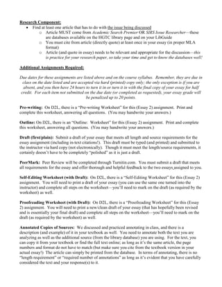 This document provides the guidelines and requirements for Essay Assignment 2, a text analysis, in the ENG 101 course taught by Professor Bolton. Key due dates include: a pre-writing assignment on October 4, an outline on October 9, a draft on October 11, peer review completed by October 15, self-editing and proofreading worksheets due October 16 and 18 respectively, and the final paper due October 18. The essay must analyze one of several provided texts, be 900-1300 words using two sources, follow MLA format, and include various preparatory assignments.