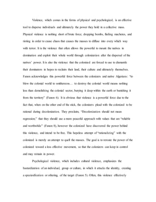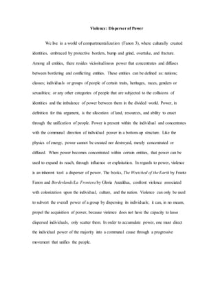 Violence can disperse power rather than concentrate it. While violence may initially seem to expand one's power through domination of others, it ultimately serves to divide individuals and weaken unified power. Two examples discussed are the Aztec use of warfare to gain influence, which created internal class divisions and led to their collapse, and Fanon's view that completely destroying colonial influence could further destabilize newly independent states. A better approach to gain power is through progressive movements that appeal to people and encourage unity around a shared cause or identity. Gloria Anzaldua's concept of "tolerance for ambiguity" offers one such model, embracing contradictions to form a new pluralistic culture after colonialism.