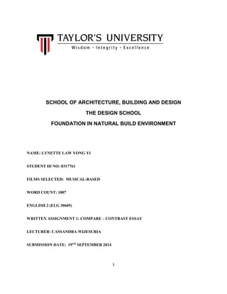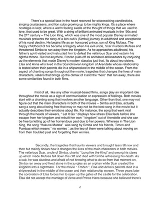 This document compares and contrasts the Disney animated musical films Frozen and The Lion King. Both films start with a chanting song in another language. They also feature tragic events that change the main characters' lives, such as the death of loved ones. Additionally, both films include villain characters that enhance the climax and convince the main characters they are responsible for tragic events. Finally, the main characters in both films run away from their problems out of fear. While they share these similarities, the document argues these elements are what make the musical films interesting.
