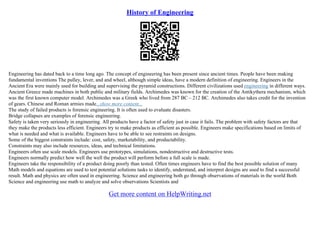 Engineering has a long history dating back to ancient times. Early engineers worked on constructing pyramids and other large structures. Over time, engineering has evolved and different civilizations used it in various ways, such as the Greeks who developed machines for both public and military purposes. Modern engineering encompasses many disciplines and uses math and science principles to solve problems. Engineers must consider constraints like cost, safety, and technical limitations in their designs.