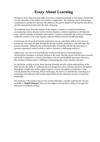 This document provides a summary of the challenges involved in writing an essay about learning. It discusses how learning is a complex topic that encompasses various domains like education, experiences, self-study, and the interplay of cognition and emotion. To encapsulate the essence of learning in an essay requires balancing breadth with depth, as well as considering the diversity of individual learning experiences. The essay also notes the dynamic nature of learning theories and technologies, making it difficult to maintain the essay's relevance over time. In conclusion, writing about learning demands a deep understanding of the topic as well as the ability to synthesize different perspectives into a coherent narrative while navigating its complexities.