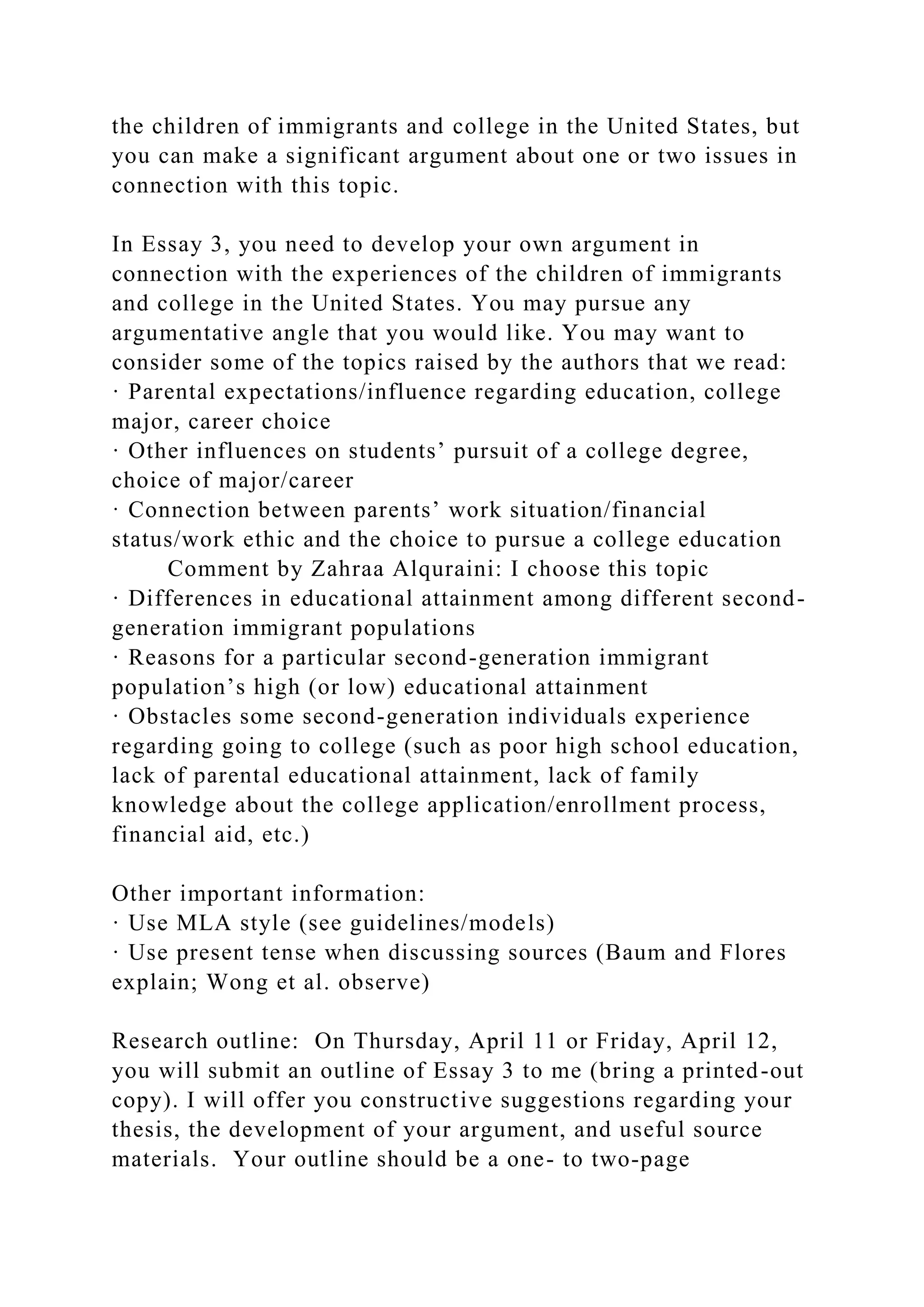 The assignment requires students to research and analyze the experiences of children of immigrants in the context of college in the United States, focusing on how parental influence shapes their education choices. Students must develop a clear thesis, support it with library and course readings, and present a structured outline before drafting their essays. Key points might include parental expectations, financial status, and the educational outcomes of different immigrant populations.