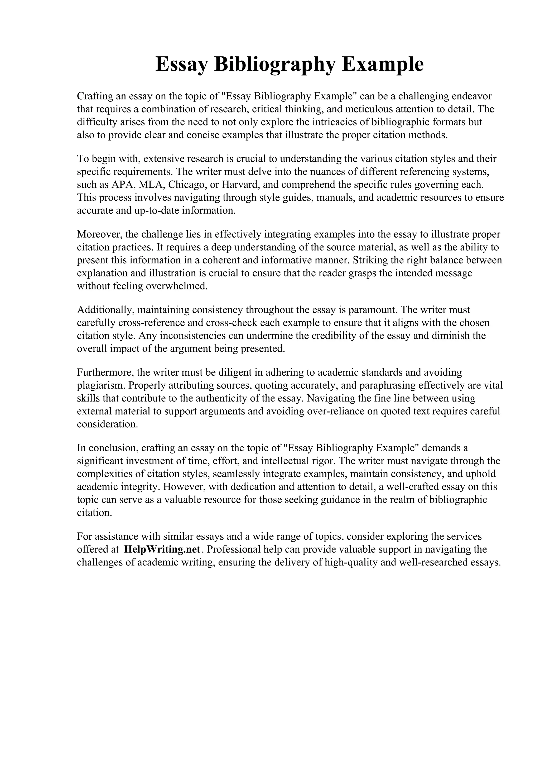 The document discusses the challenges of crafting an essay focused on bibliographic citation examples, highlighting the need for thorough research on citation styles and the integration of clear examples. It emphasizes the importance of consistency and academic integrity in citation practices while also offering a glimpse into various unrelated topics such as literature, acting schools, historical events, and environmental issues. Overall, it underscores the complexity of essay writing across diverse subjects and the dedication required to achieve clarity and accuracy.