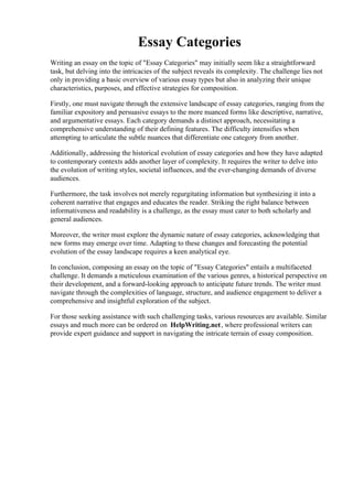 The document discusses the intricacies involved in writing essays on various categories, emphasizing the importance of understanding each type's unique characteristics and the complexities that arise from their historical context and audience engagement. It highlights the need for a coherent narrative and adaptability to emerging essay forms, while suggesting resources for assistance in mastering essay composition. Additionally, it briefly touches upon literary works and themes, exploring how narratives and artistic expressions can convey deeper meanings and historical significance.