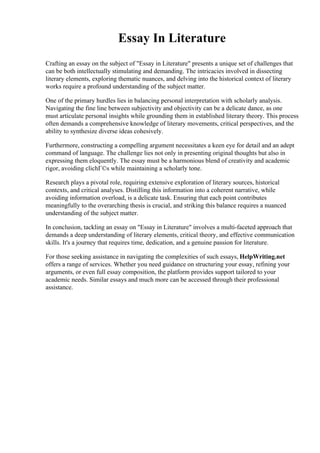 Crafting an essay on literature presents unique challenges that require profound understanding of literary works and their historical contexts. One hurdle is balancing personal interpretation with scholarly analysis by grounding subjective insights in literary theory. This process demands comprehensive knowledge of literary movements and the ability to synthesize diverse ideas cohesively. Constructing a compelling argument necessitates close attention to detail and eloquent expression of original thoughts in an academic yet creative manner. Research involves extensive exploration of sources and contexts to distill into a coherent narrative without overwhelming information. Tackling a literature essay is a multifaceted process demanding deep understanding of elements, theory, and communication skills through dedication and passion for literature.